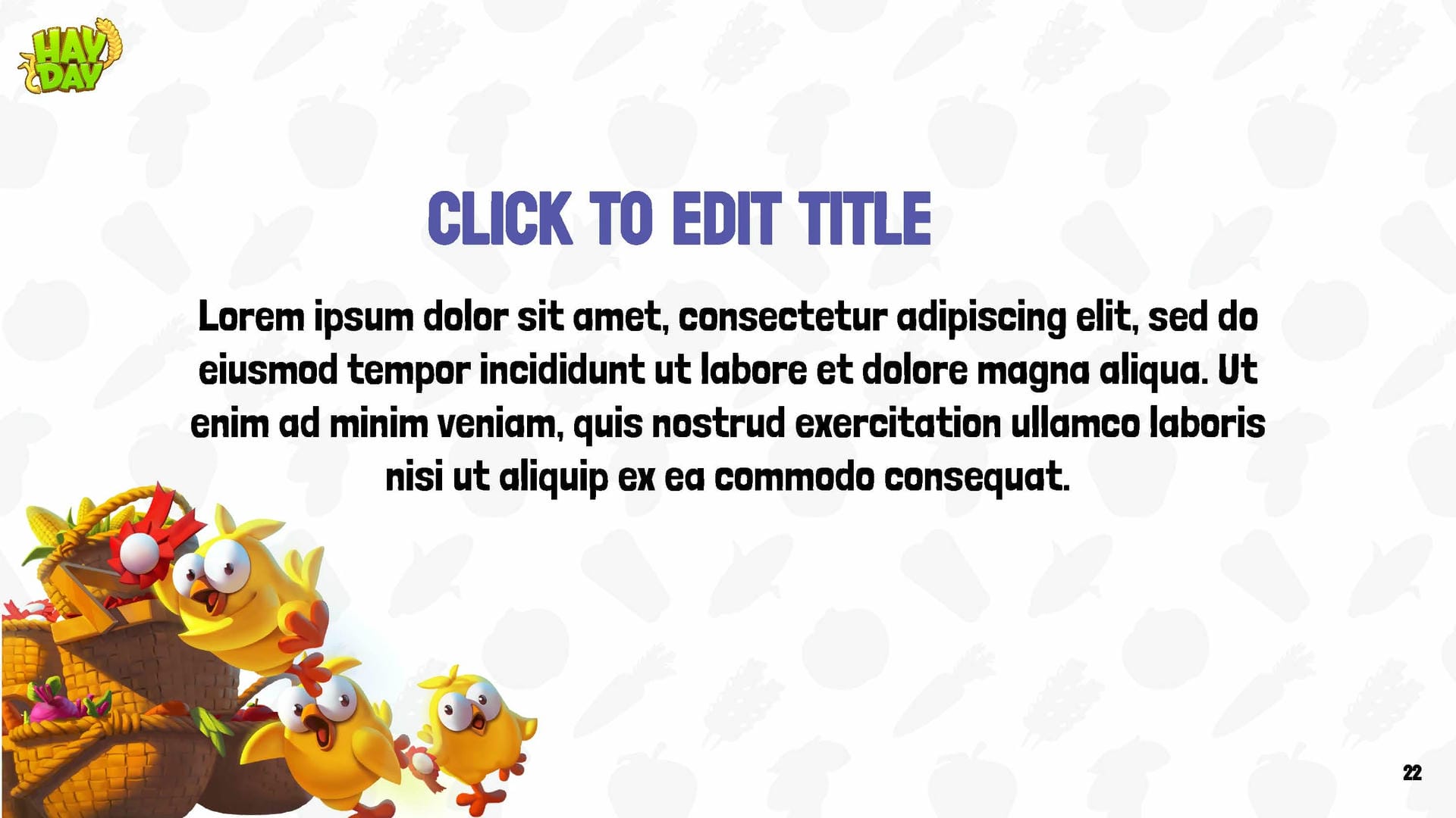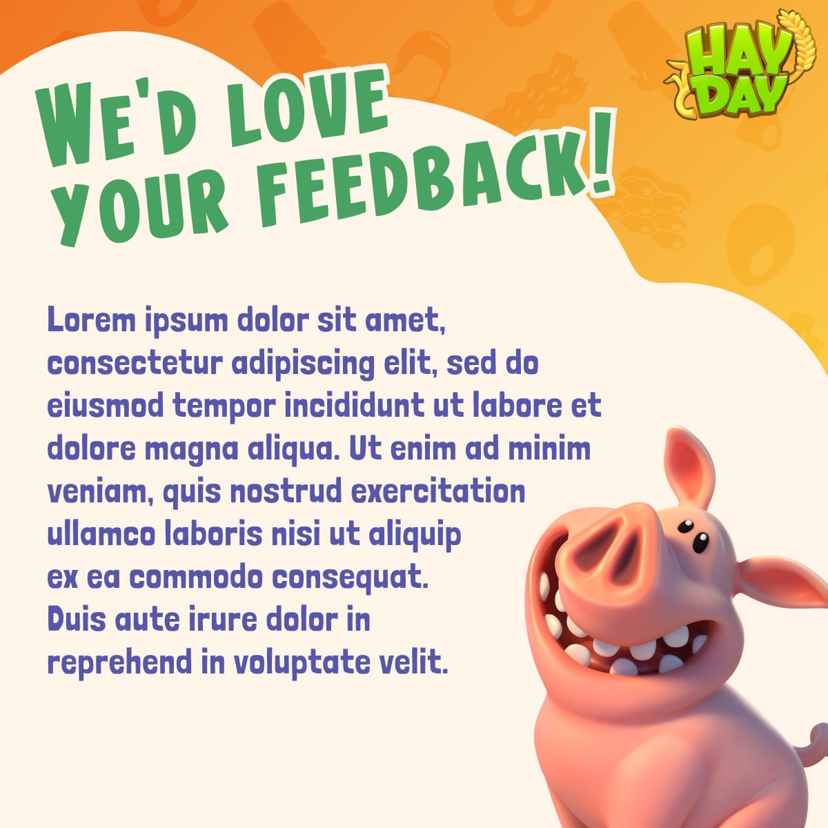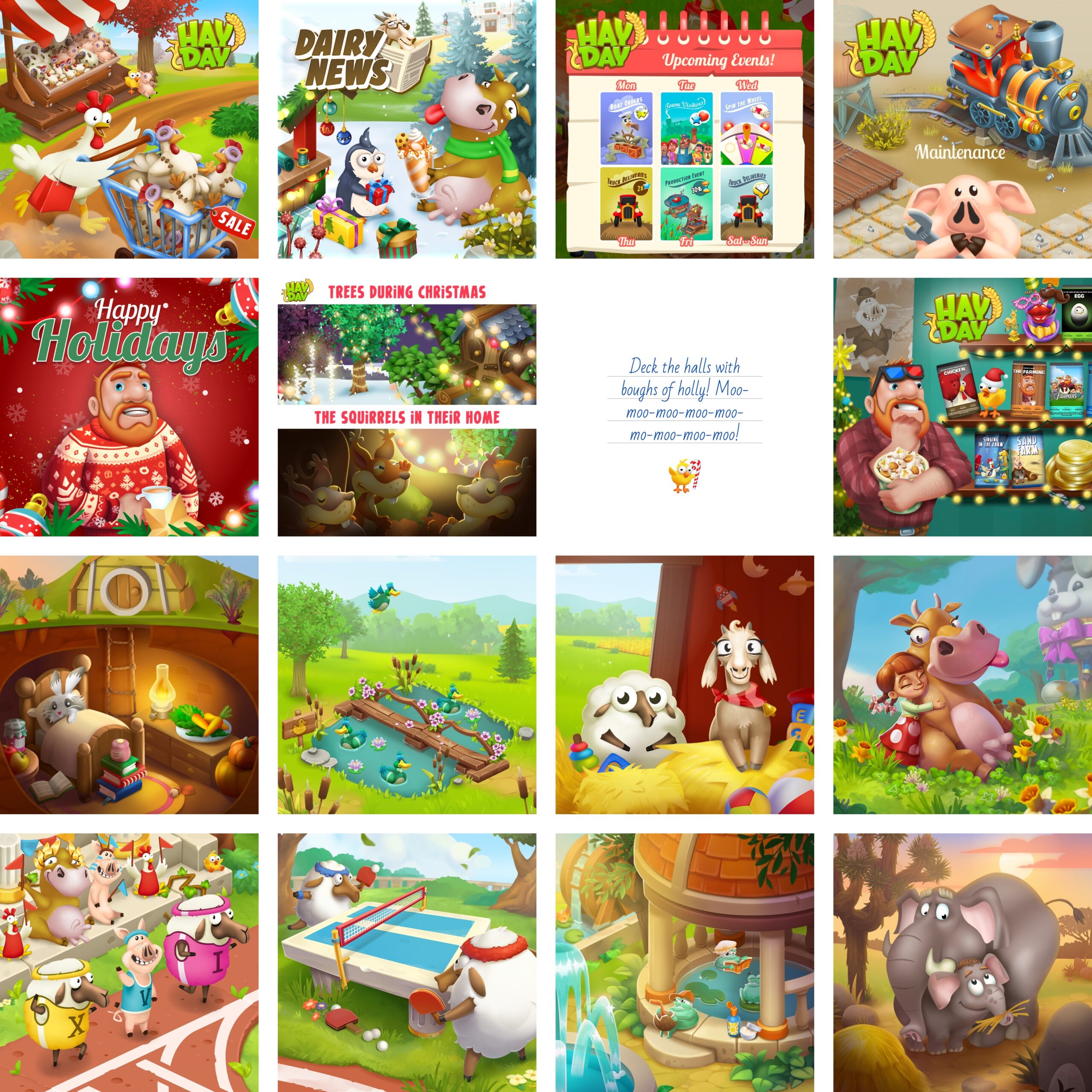 My task was to approach the branding with a fresh perspective, suggest solutions for current marketing challenges, restore consistency in the look and feel of Hay Day's brand and marketing visuals, and capture the game’s unique tone of voice while maintaining its brand integrity.