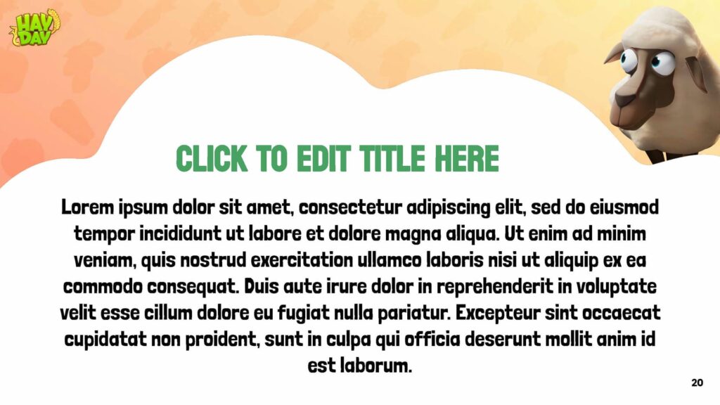 Our goal is to create a new Hay Day brand guideline to standardise all content. We revisited colours, backgrounds, typography treatments, UI elements and 2D/3D character assets, while also introducing new elements such as cloud-shaped containers, patterns, a new body font, increased use of 3D visuals, updated templates and layouts. This has resulted in a defined style that delivers cohesive visuals and reduces the need for costly, bespoke illustrated content.