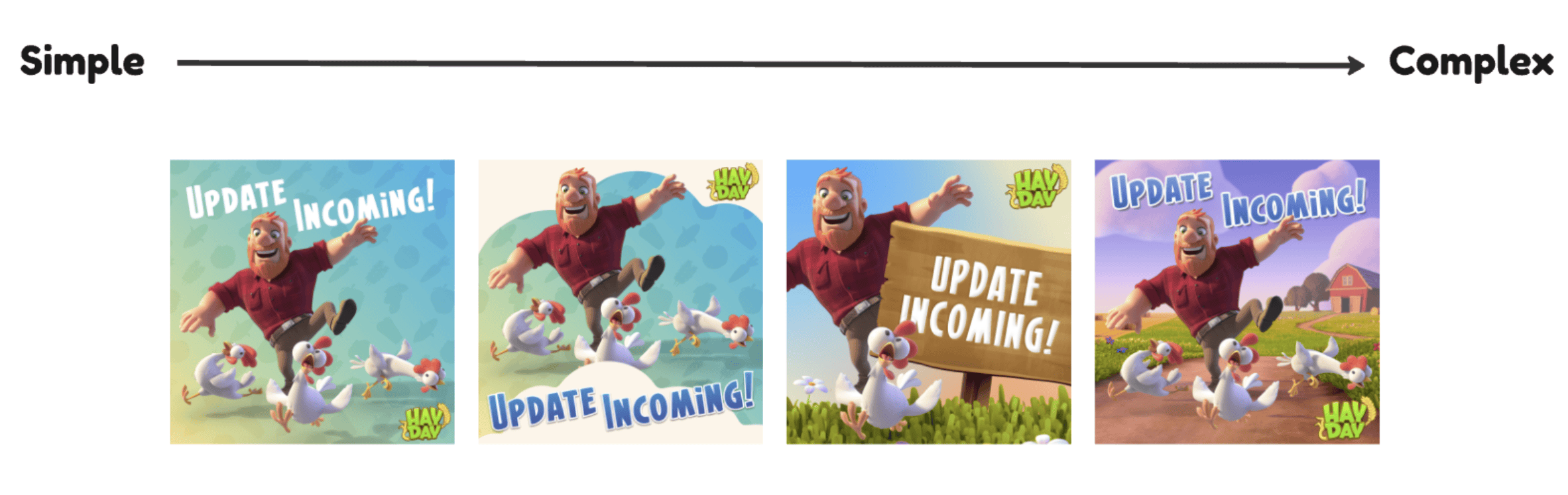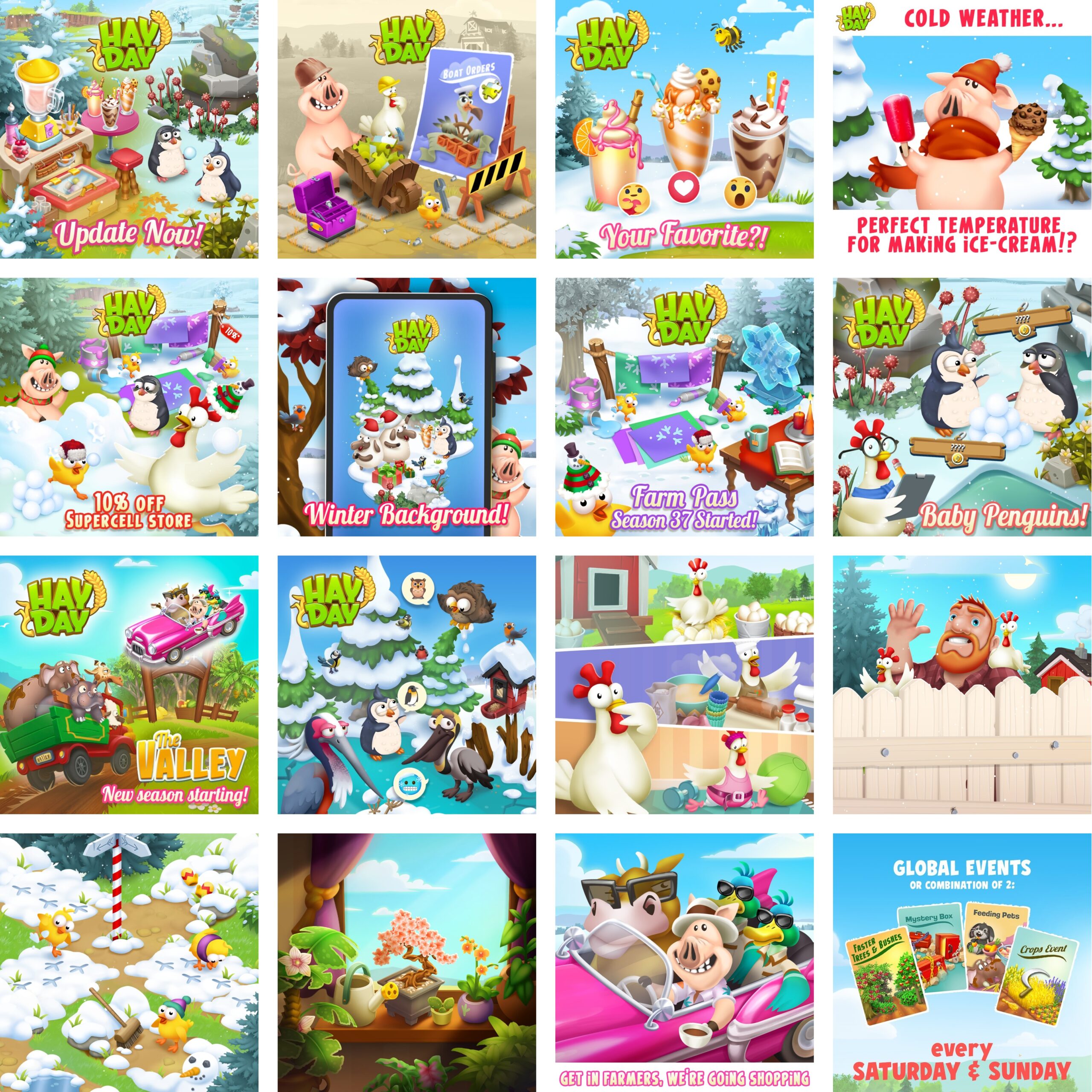 We reviewed all marketing creatives from 2023–2024, identified known issues and explored opportunities. Additionally, we analysed Hay Day Pop — a game that has been sunset but offers valuable insights into art direction and style for a modern Hay Day aesthetic. We also examined other Supercell games to ensure the new Hay Day visual messaging aligns with the broader Supercell universe.